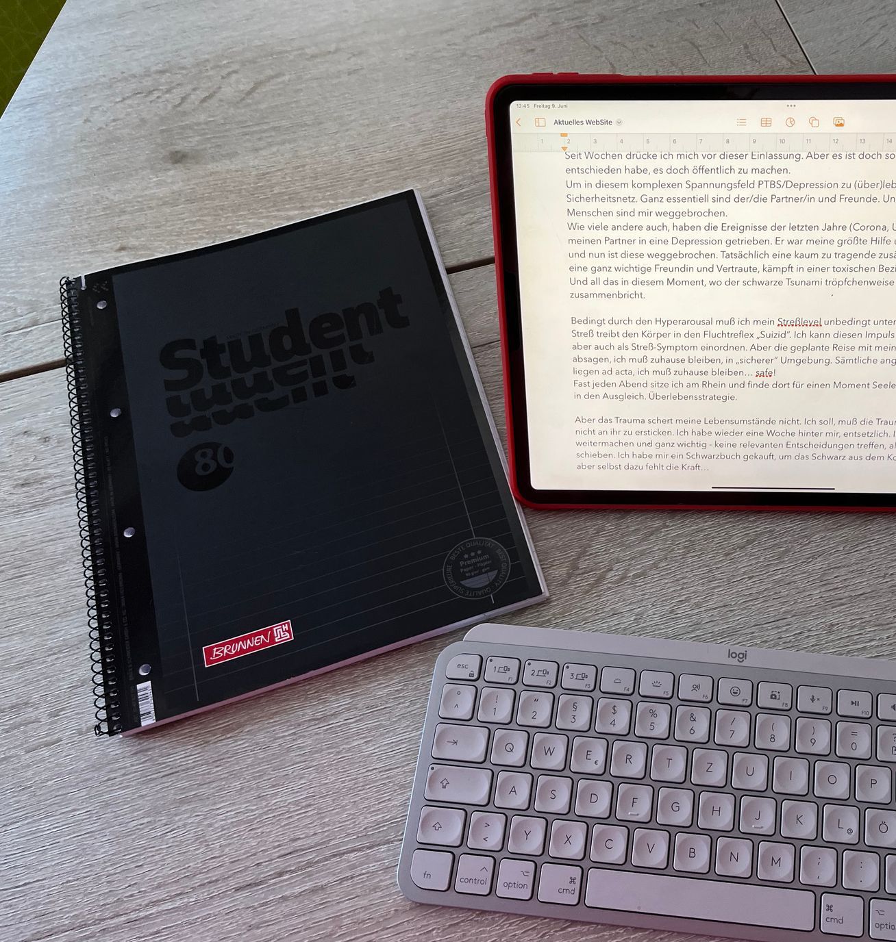 Aber das Trauma schert meine Lebensumstände nicht. Ich soll, muß die Traurigkeit zulassen, um nicht an ihr zu ersticken. Diese (nach)erlebte Traurigkeit macht die Welt surreal, aus der Zeit gefallen, die „Draußen-Zeit“ passt nicht zur „Innen-Zeit“, alles merkwürdig verschoben. Ich habe wieder Wochen hinter mir, entsetzlich. Irgendwie weitermachen und ganz wichtig - keine relevanten Entscheidungen treffen, alles irgendwie verschieben. Ich habe mir ein Schwarzbuch gekauft, um das „Schwarz“ aus dem Kopf zu schreiben und die Seele zu entlasten, aber selbst dazu fehlt die Kraft…