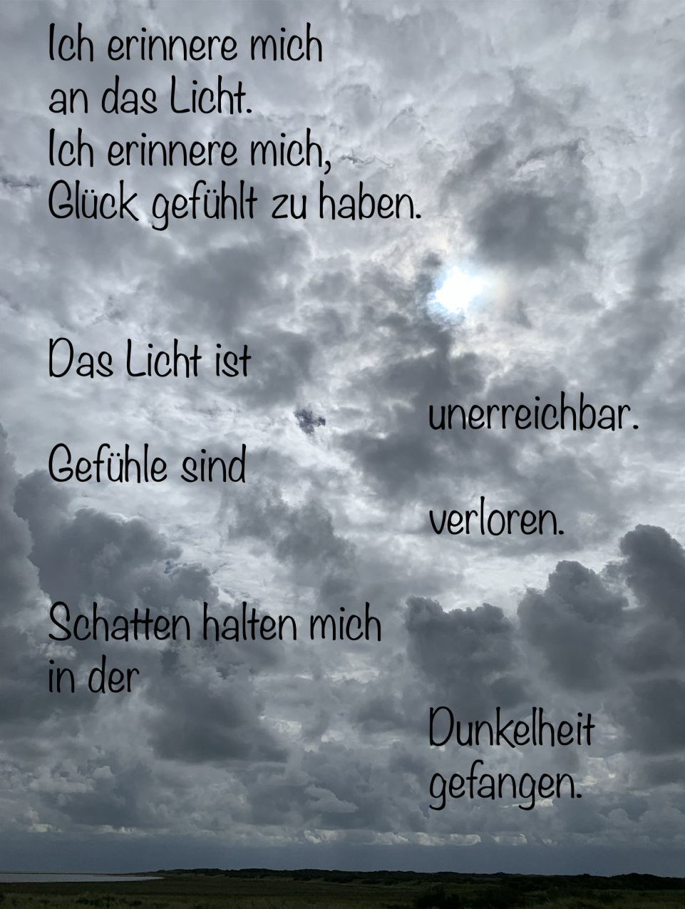 Weihnachtszeit. Wir waren ganz still und ich habe drei Tage in mich hineingeschaut, Bestandsaufnahme. Innenansicht einer Depression. Innenansicht eines Traumas. Da ist nichts in mir. Nur Leere, tiefe schwarze Leere. Endlos. Unendlichkeit. Einfach nichts...